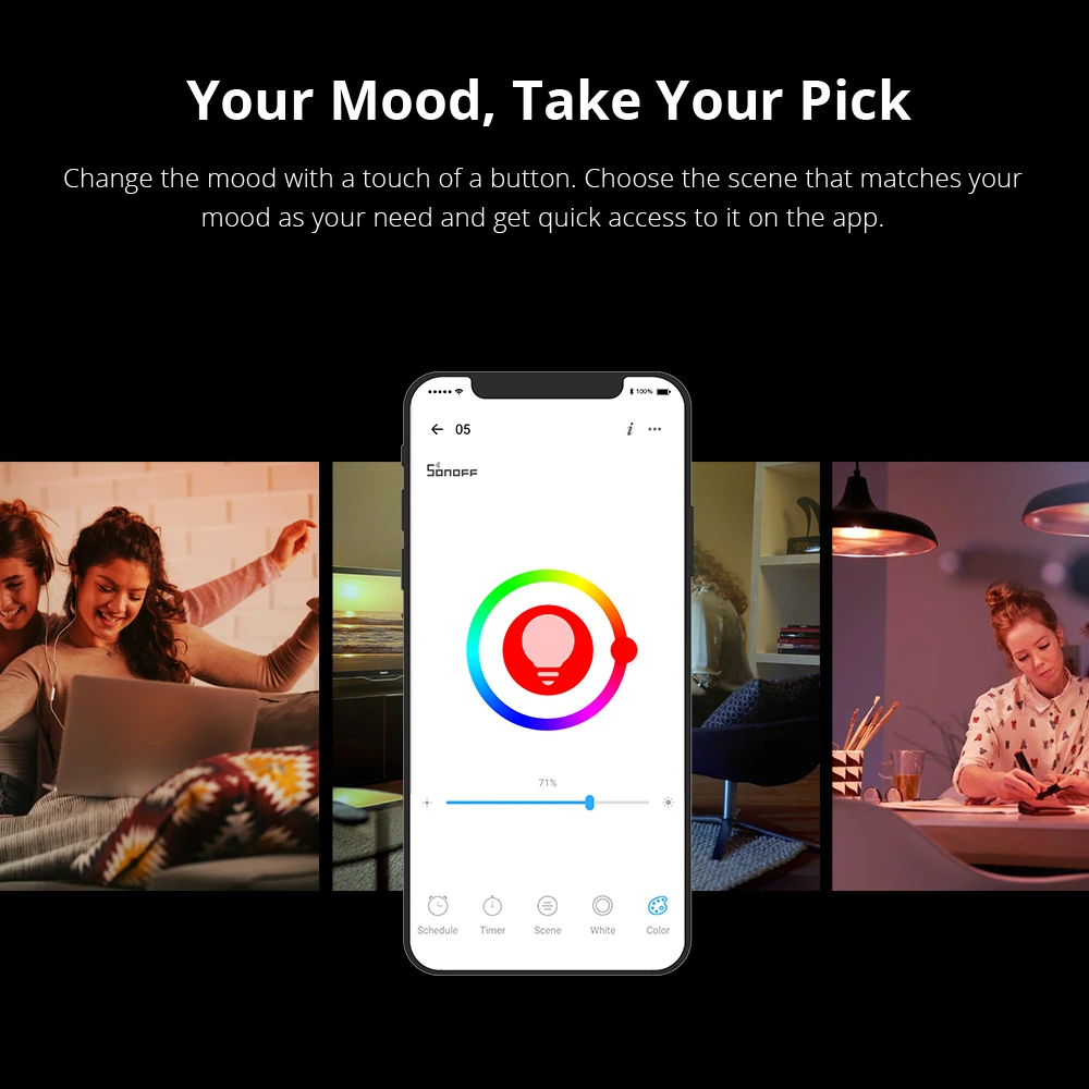 Change the mood with a touch of a button. Choose the scene that matches your mood as your need and get quick access to it on the app.