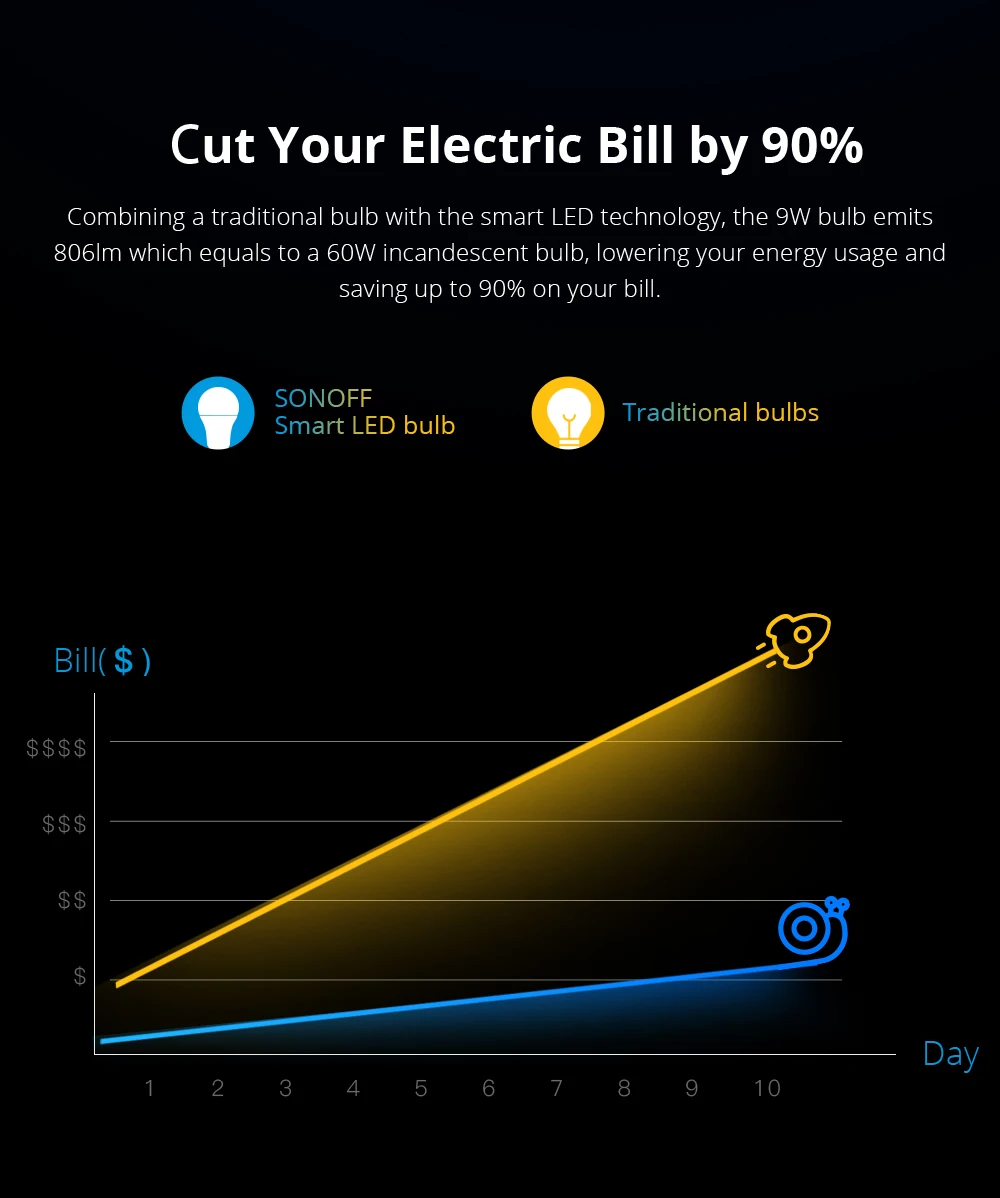 Combining a traditional bulb with the smart LED technology, the 9W bulb emits 806lm which equals to 60W incandescent bulb, lowering your energy usage and saving up to 90% on your bill.