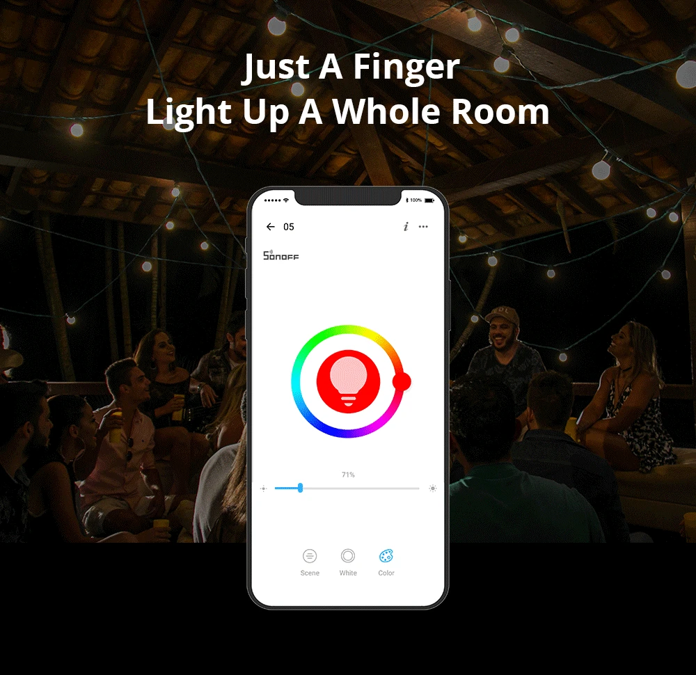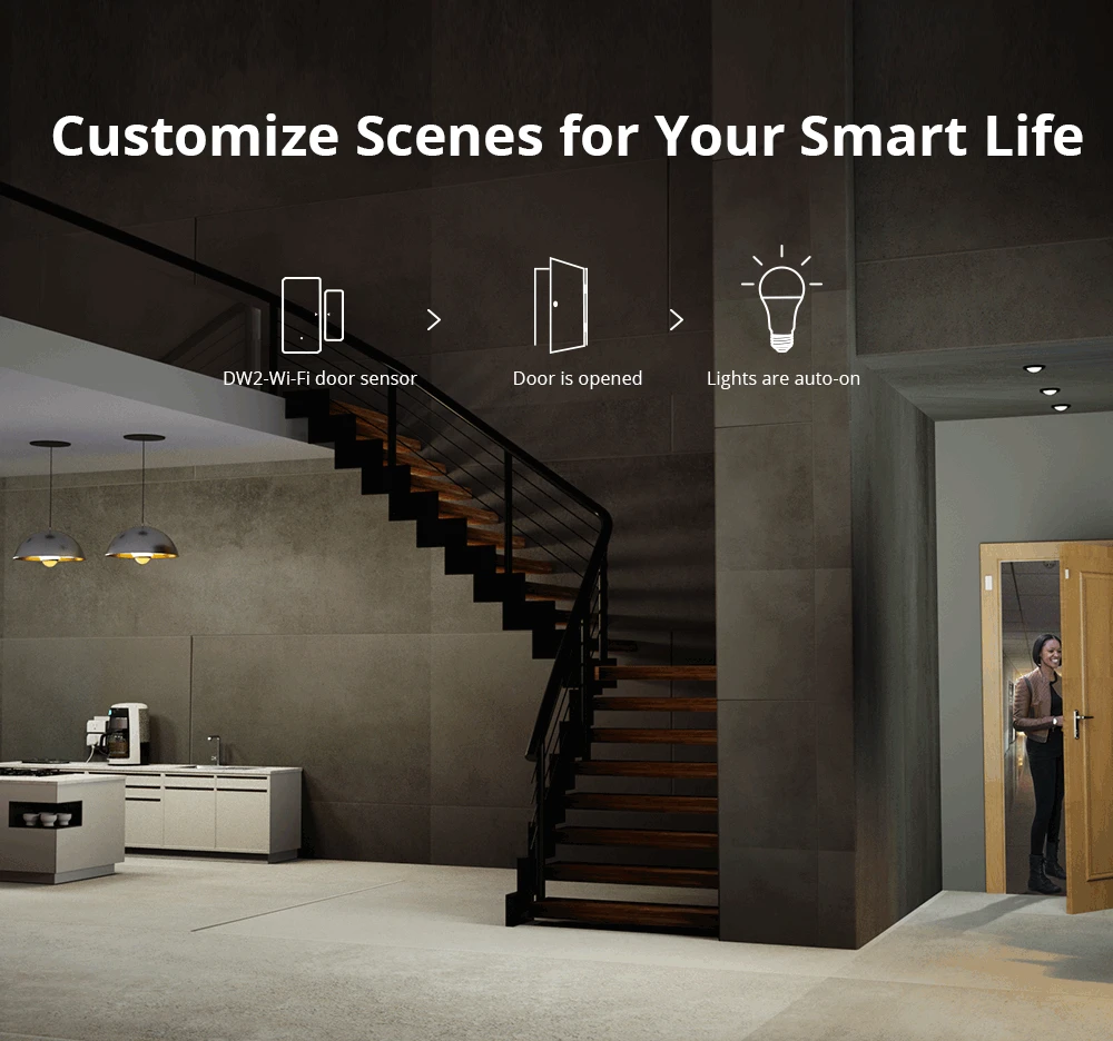 A lighted home is ready for you when you walk through the door. Match with SONOFF DW2-WiFi door sensor to accomplish the scene that the bulb turns on automatically when your door is opened.