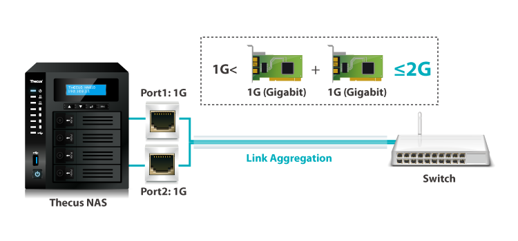 | Link aggregation can sustain multiple network connections and provide redundancy in case one of the links fails. Thecus NAS supports 7 modes which provide Load Balance, Failover, 802.3ad, Balance-XOR, Balance-TLB, and Balance-ALB, Broadcast. | ||