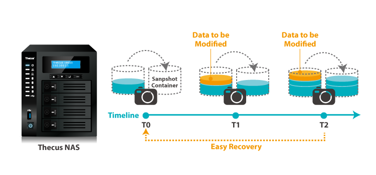 | With BTRFS support, Thecus NAS users can enjoy the simplicity of snapshot backups. Through BTRFS subvolumes, snapshots of data at various time points can be manually or automatically made and just as easily later restored to rollback files or folders to previous states. | ||