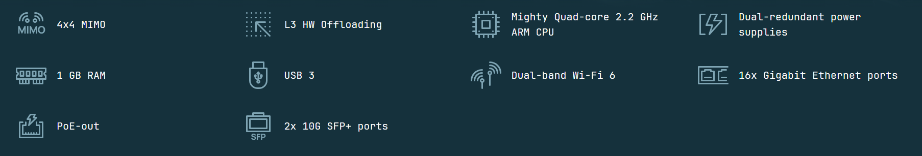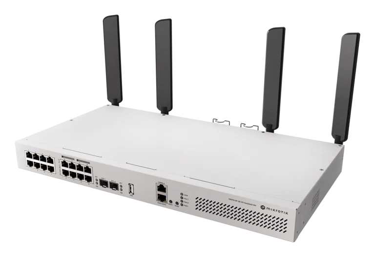 CRS418-8P-8G-2S+5axQ2axQ-RMThe Wi-Fi version of CRS418... with our strongest 4x4 MIMO Wi-Fi 6! L3 HW offloading, quad-core 2.2 GHz ARM CPU, 16x Gigabit Ethernet ports + a Gigabit management port with a direct CPU line, 2x 10G SFP+ ports, PoE-out. |