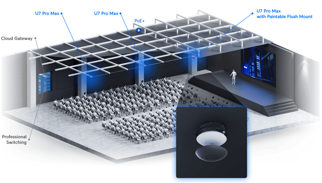 it meets high-demand environments. Powered via PoE+ and featuring a 2.5 GbE uplink, the U7-Pro-Max delivers powerful and flexible networking solutions.