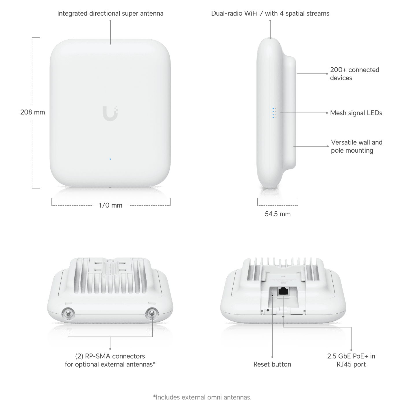 ensures balanced and flexible coverage. Supporting over 200 connected devices, this weatherproof device is powered via PoE+ and includes